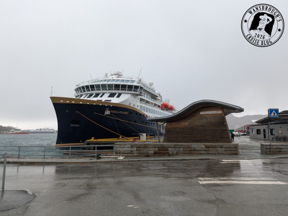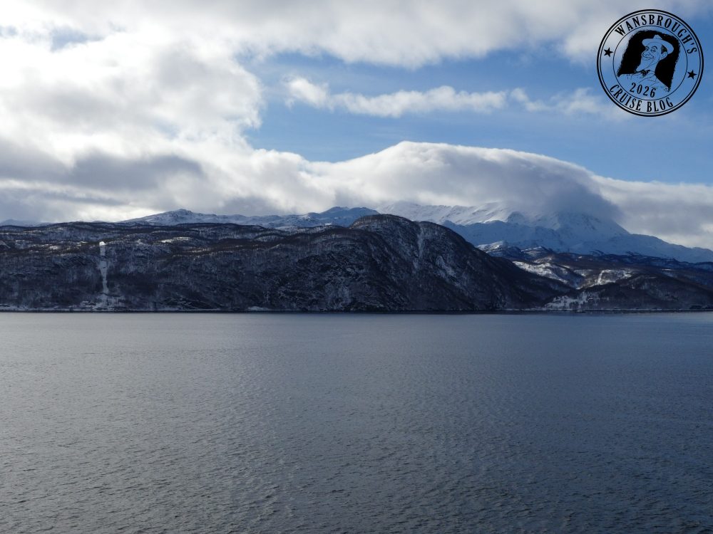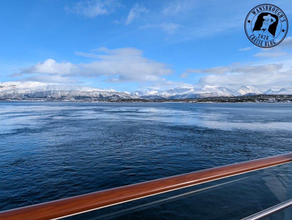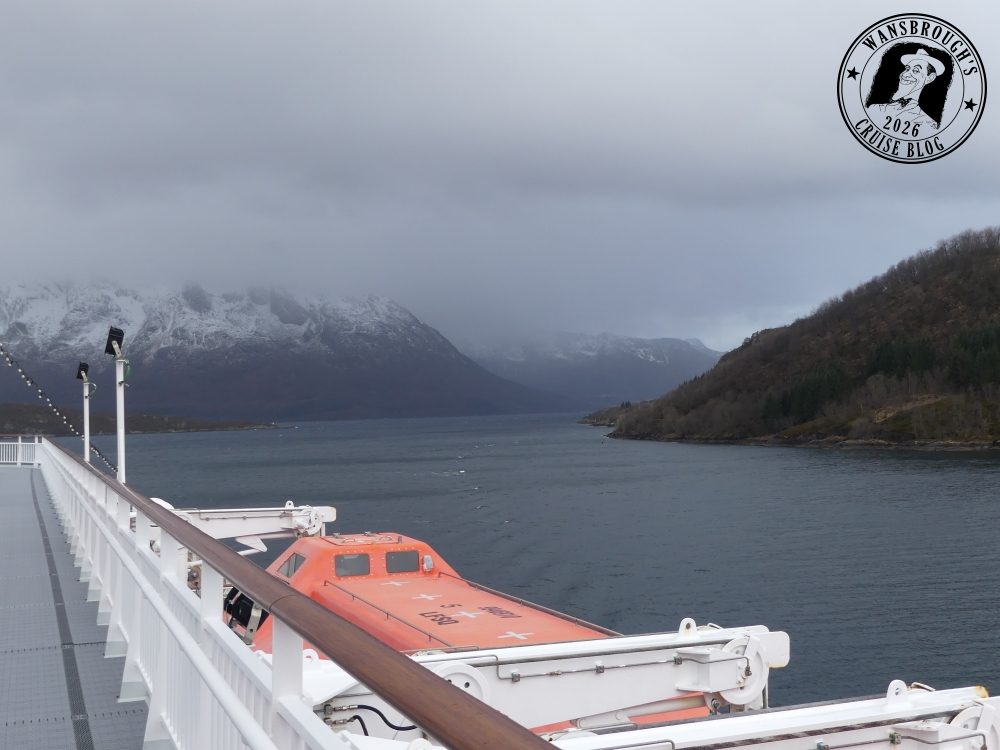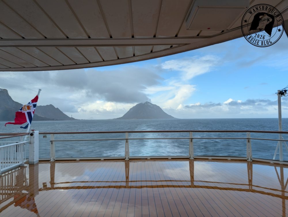 As it happened, we both slept really well and my Fitbit clocked my sleep at 9 hours. We received an announcement over the ships PA shortly before 6:45 telling us we were about to cross the Arctic Circle at 66°33’N. so the weather obviously didn’t slow us down any. At precisely 7:11 we officially crossed that invisible line into the Arctic, however due to the weather, the outside decks were closed off, so in order to capture a photo of the monument which is a large metal globe on the island of Vikingen. I had to use my phone up against the glass but the results weren’t good so I have decided not to post any on the blog.