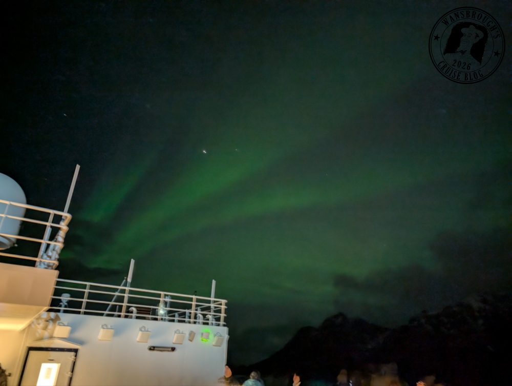 The Northern Lights alarm sounded on our cabin phone last night and I have never seen Nicole get dressed and move so fast. She was out of the cabin before I had put my trousers on. When I eventually got up on the top deck there was a large congregation of passengers already there all looking skyward with phones and cameras focusing on the faint clouds in the sky. Although there was a very thin layer of cloud, we still managed to get a glimpse and are hopeful of better things to come as we head further north.