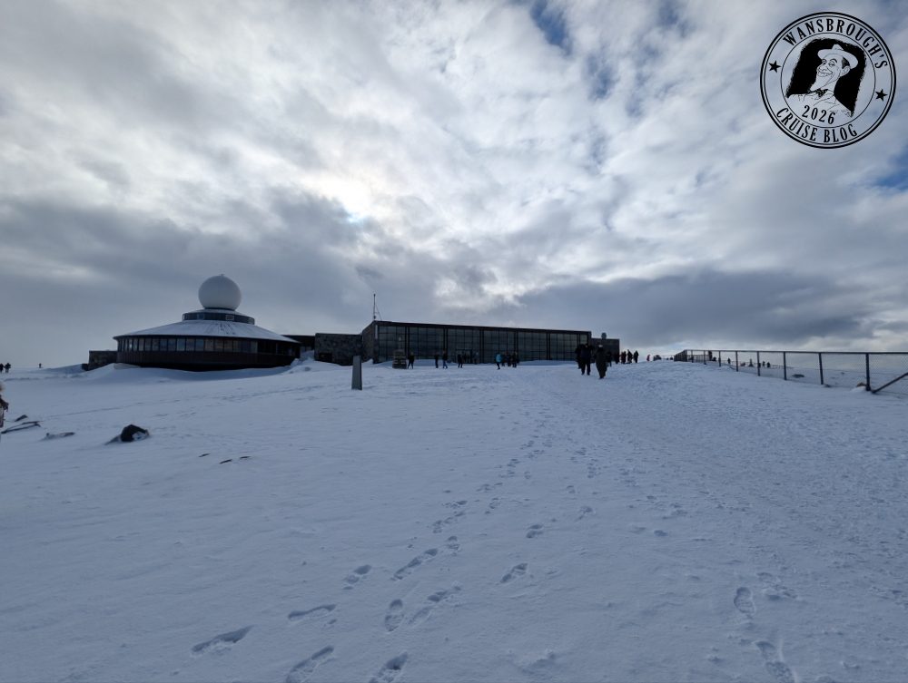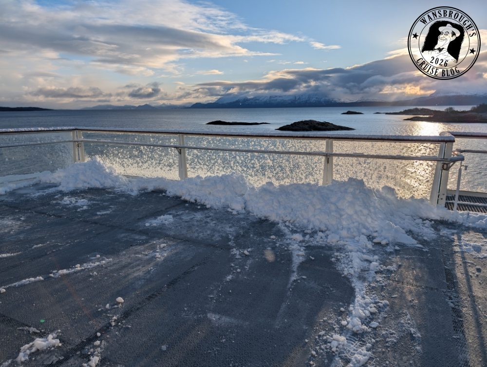This morning, on our route to breakfast, we went out to the upper deck for some fresh air and were greeted with snow on the decks. I noticed it was snowing during the night but hadn’t considered it would settle.