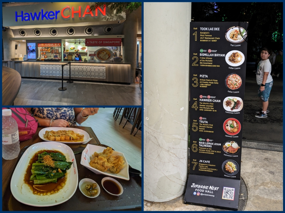 Before leaving the park we stopped for a quick bite to eat in the Jurassic Nest FoodHall. It’s a self service food venue with a dinosaur theme selling Michelin Rated Food from several different vendors. Not expensive and really tasty. We opted for something from Hawker Chan who was the world’s first hawker to be awarded One Michelin Star. Half way through eating a large T-Rex came to life which not only the kids enjoyed but adults alike. Great experience and out of the ordinary.
