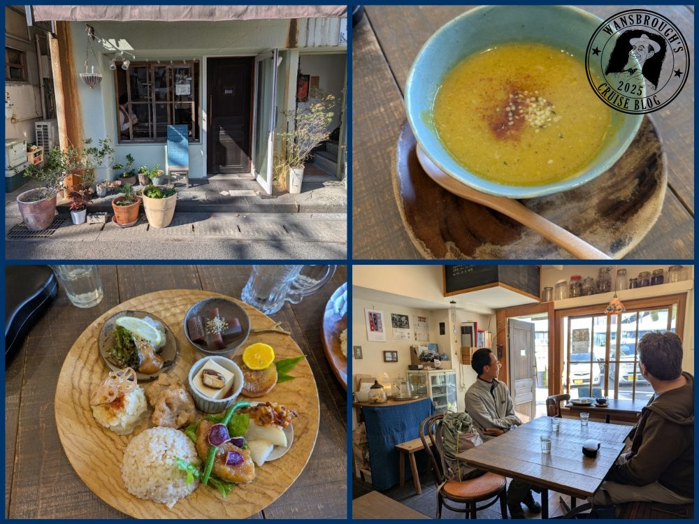 It was then back to Kagoshima for a spot of lunch which today was in a little vegan cafe called Café Indigo which is operated by a lady who runs it single handed. It’s a set meal which starts with soup then followed by a platter of vegan Japanese bites. It was really tasty and Nicole was chuffed to bits with it, she even had a Soy Masala Chai tea for the first time, and our guide who has a keen interest in food accepted our invitation to join us seemed to be impressed with the offerings.