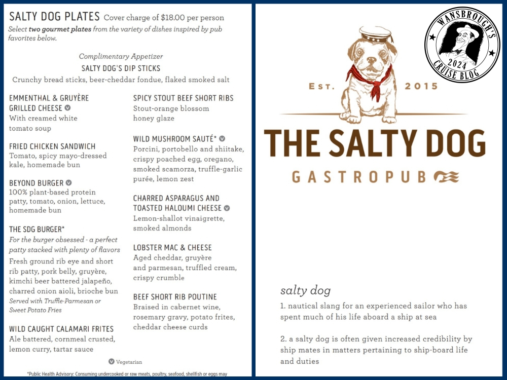 Now a grumble, as part of the Princess Plus Package you get two included meals at no cost in the ship’s casual restaurants, on Princess these include Vines, Salty Dog Pub, O’Malleys, Ocean Terrace, Planks, Steamers, Alfredo’s, and GiGi’s. Now on Crown Princess, all we have is Vines Wine Bar (I’m not sure it’s applicable) and The Salty Dog Gastropub which is inside The Wheelhouse Bar. The gastro pub has on their menu a Beyond Burger which is vegan so we thought that’s great, we will use our included meals one lunchtime on one of the sea days. A good idea in principle if it was open at lunchtime. It turns out that the opening hours are from 5:30 – 9:30 so the only way we can give it a go would have been to let gluttony lead us astray and have both a meal there and in the MDR or forfeit the latter. It’s not an extensive enough menu to become an evening meal but it would make a great pub lunch.