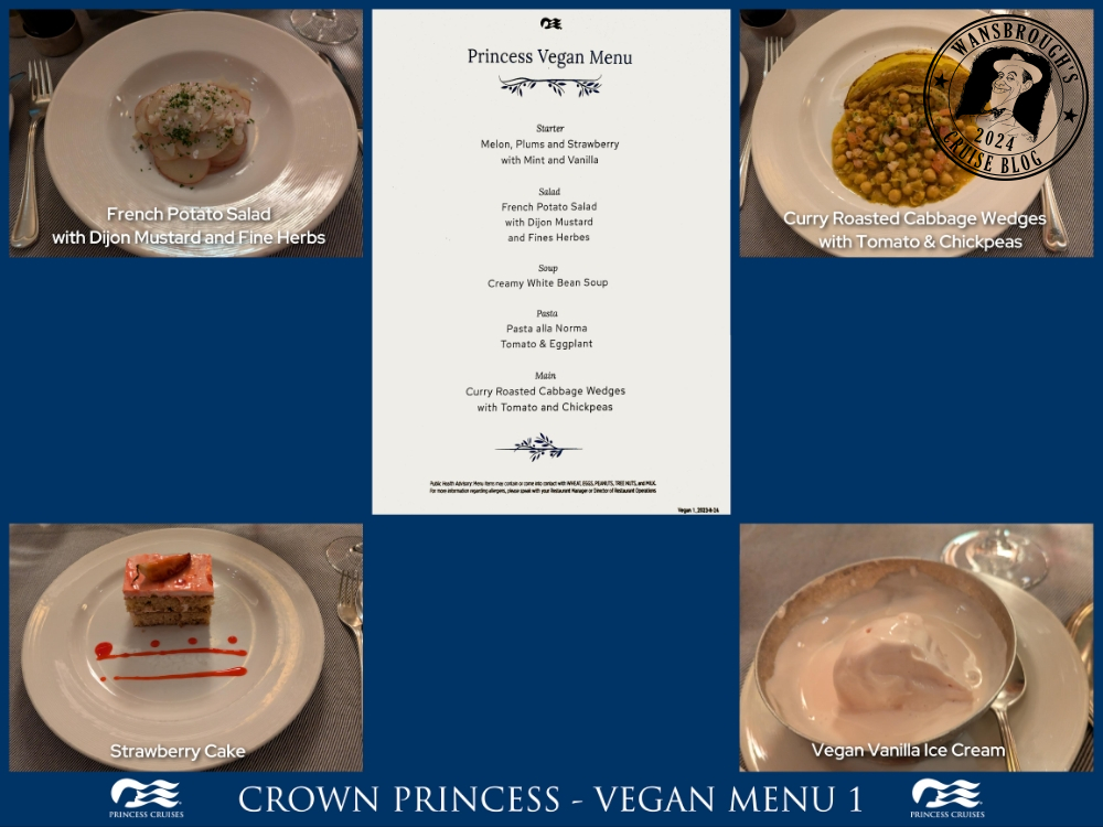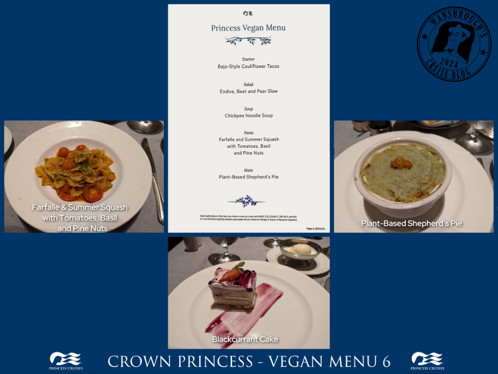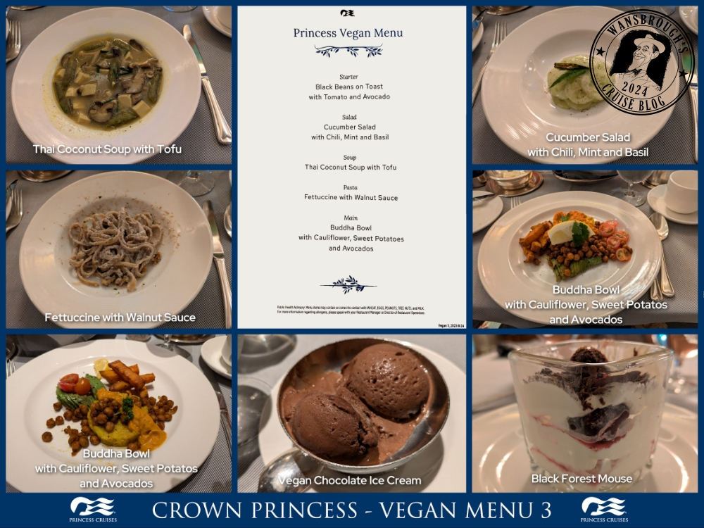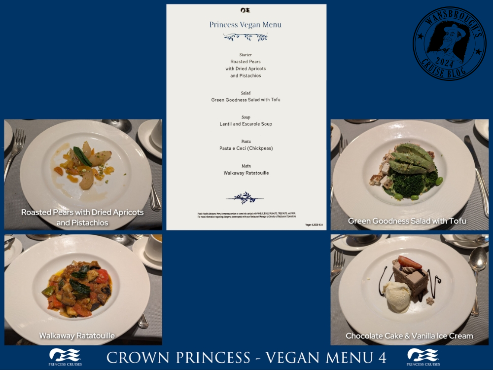 The evening meal in the MDR was a huge success and Nicole was able to select dishes and get a very balanced diet. There were more protein options with Princess than on any of the other cruise lines that have provided a vegan menu.